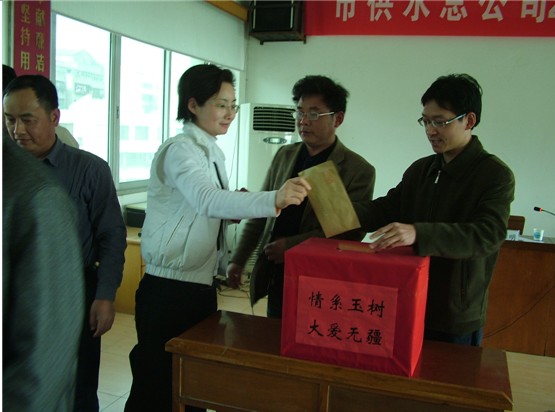 4月26日,荊門市供水總公司舉行“情系玉樹 大愛無疆“捐款活動,供水職工慷慨解囊、捐款踴躍,短短的時間,共募得善款18170元,圖為捐款現場場景。