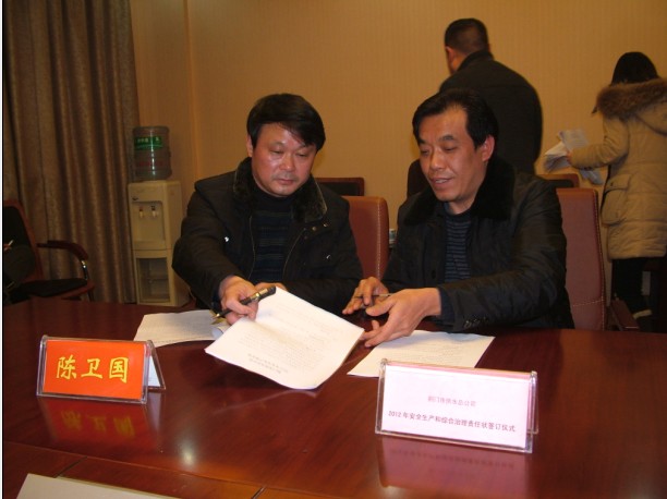 總經(jīng)理陳衛(wèi)國與公司各單位主要負(fù)責(zé)人簽訂2012年安全生產(chǎn)責(zé)任狀和綜合治理責(zé)任狀。
