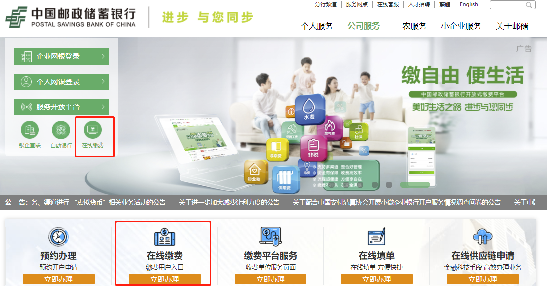 登錄繳費(fèi)用戶登錄“中國郵政儲(chǔ)蓄銀行”官網(wǎng)(http://www.psbc.com/cn/),點(diǎn)擊“服務(wù)快捷通道-在線繳費(fèi)”進(jìn)入,無需注冊及登錄。