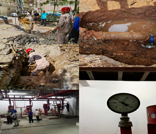 新世界小區(qū)均為高層建筑,消防安全至關(guān)重要。王強(qiáng)華經(jīng)理當(dāng)機(jī)立斷,第一時(shí)間上報(bào)集團(tuán)領(lǐng)導(dǎo),并迅速組織人員趕赴現(xiàn)場(chǎng)。經(jīng)查,該小區(qū)生活用水管道均無(wú)異常,不會(huì)影響業(yè)主正常用水,但消防管道漏損部位較為特殊,僅靠物業(yè)公司單兵作戰(zhàn),難度頗大。王經(jīng)理請(qǐng)示集團(tuán)領(lǐng)導(dǎo),希望從三水廠抽調(diào)維修人員前來(lái)助陣。