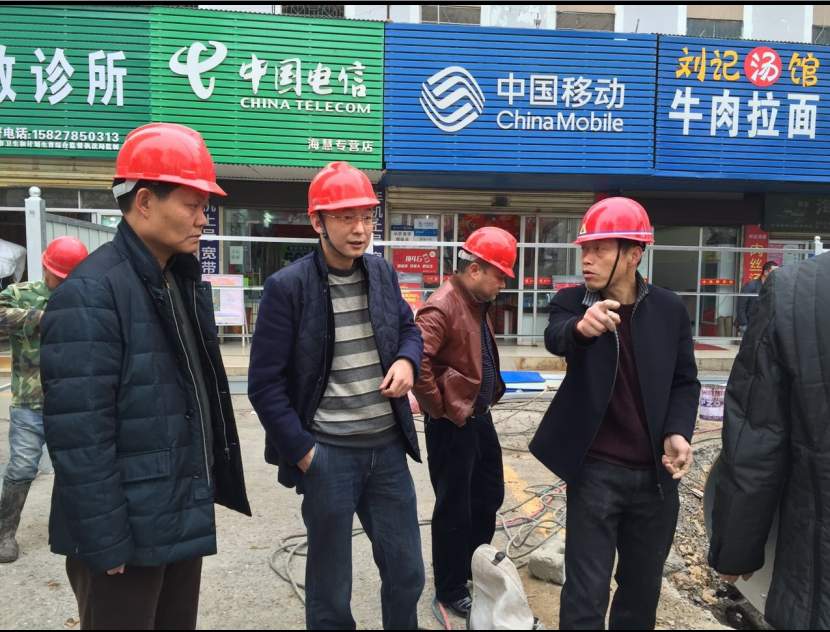 荊門市供水總公司黨委書記、總經(jīng)理陳永根(左二)等在象山大道?;鄣叵峦ǖ拦┧艿朗┕がF(xiàn)場。