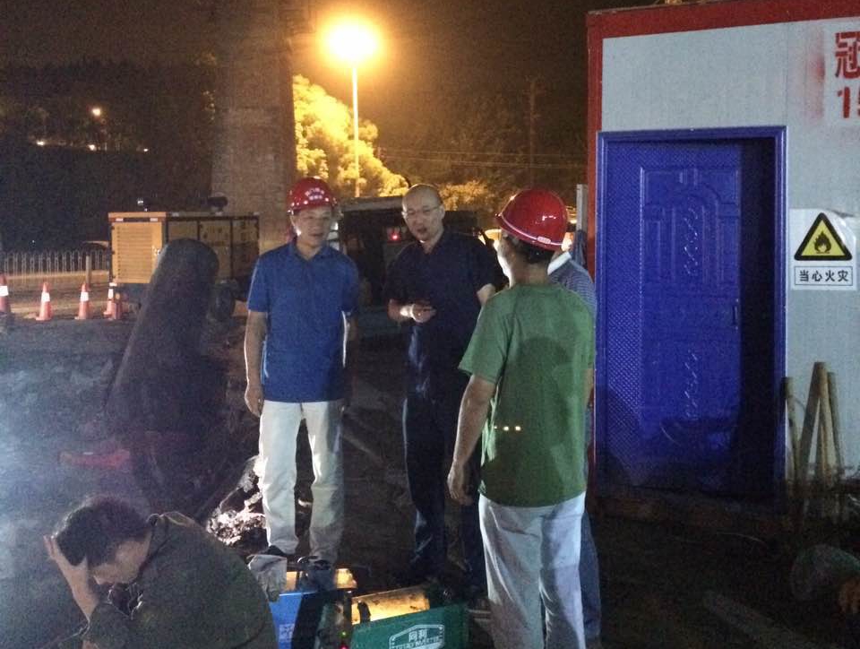 此次施工任務(wù)重、時間緊、戰(zhàn)線長、交叉作業(yè)多、未知因素多,市供水總公司科學組織、準備充分、措施有力,創(chuàng)造了荊門供水單次停水施工碰頭數(shù)量最多、停水時間最短的歷史紀錄!此次施工前,市供水總公司審時度勢,啟動了應(yīng)急預(yù)案,從人員、物資、設(shè)備、應(yīng)急搶險等各方面都做了充分準備。當晚,公司黨委書記、總經(jīng)理陳永根親臨施工現(xiàn)場,坐鎮(zhèn)一線指揮,要求相關(guān)部門集中力量,全力配合,爭取在最短的時間內(nèi)完成施工,盡快恢復(fù)供水。在爭分奪秒的施工過程中,全體參戰(zhàn)單位和人員在總公司領(lǐng)導正確指揮下,發(fā)揚"特別能吃苦、特別能戰(zhàn)斗、特別能奉獻"的“供水鐵軍”精神,團結(jié)一心,眾志成城,密切配合,群策群力,譜寫了供水人敢與時間賽跑、敢同困難較勁的“合奏曲”。維修公司、安裝公司、營抄中心工作人員作為搶修主力軍,在悶熱的坑洞下和污濁的泥水中實行分班作業(yè)、輪流施工,艱苦作業(yè)。職能部門管網(wǎng)運維部、工程管理部、客服中心、水質(zhì)檢測公司積極發(fā)揮統(tǒng)籌協(xié)調(diào)能力,調(diào)度應(yīng)急供水車緊急供水、調(diào)配管材物質(zhì)、快速水質(zhì)化驗……竭盡全力地為DN1000管道碰頭施工保駕護航。