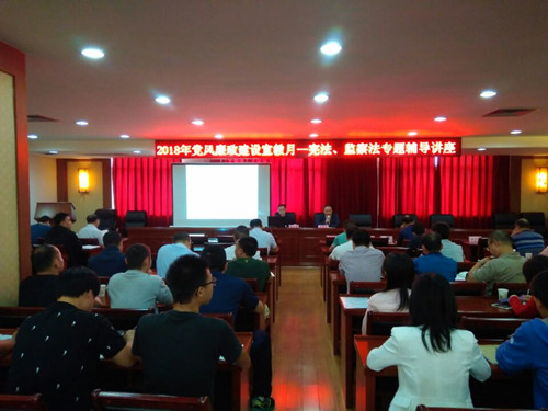 吳衛(wèi)東教授首先從《憲法》修改的重大意義、基本原則和過程、主要內(nèi)容以及貫徹實施憲法等方面,深刻講解了憲法作為治國安邦總章程的內(nèi)涵,倡導大家尊崇憲法、學習憲法、遵守憲法、維護憲法、運用憲法。隨后從監(jiān)察制度改革的必要性,《監(jiān)察法》的性質(zhì)、主要內(nèi)容及相關法律制度等方面,闡述了黨中央全面依法治國的力度和決心。此次講座觀點明確、內(nèi)容詳實,語言生動、時代感強,對與會人員進一步增強憲法意識、弘揚憲法精神,提高依法依規(guī)履職盡責具有很強的現(xiàn)實指導意義。