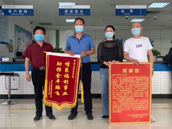 5月15日上午,荊門市金豐新材料有限公司總經(jīng)理袁家群和東寶區(qū)工商聯(lián)相關(guān)負責(zé)人來到市供水總公司,送上感謝信和寫有“情系福利事業(yè) 助推金豐騰飛”的鮮艷錦旗,以感謝市供水總公司想企業(yè)之所想、急企業(yè)之所急,用實際行動踐行初心使命,助推企業(yè)復(fù)工復(fù)產(chǎn)。