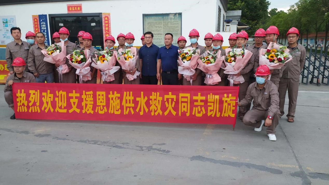 7月27日晚7時,市供水總公司逆行出征恩施市的應(yīng)急供水救援隊全部平安凱旋。公司黨委委員、副總經(jīng)理曾波帶領(lǐng)相關(guān)負責(zé)人趕往荊門北高速公路出口迎接,獻上鮮花感謝8名隊員勇往直前,不畏艱險,圓滿完成了這次艱巨的供水救援任務(wù)。
