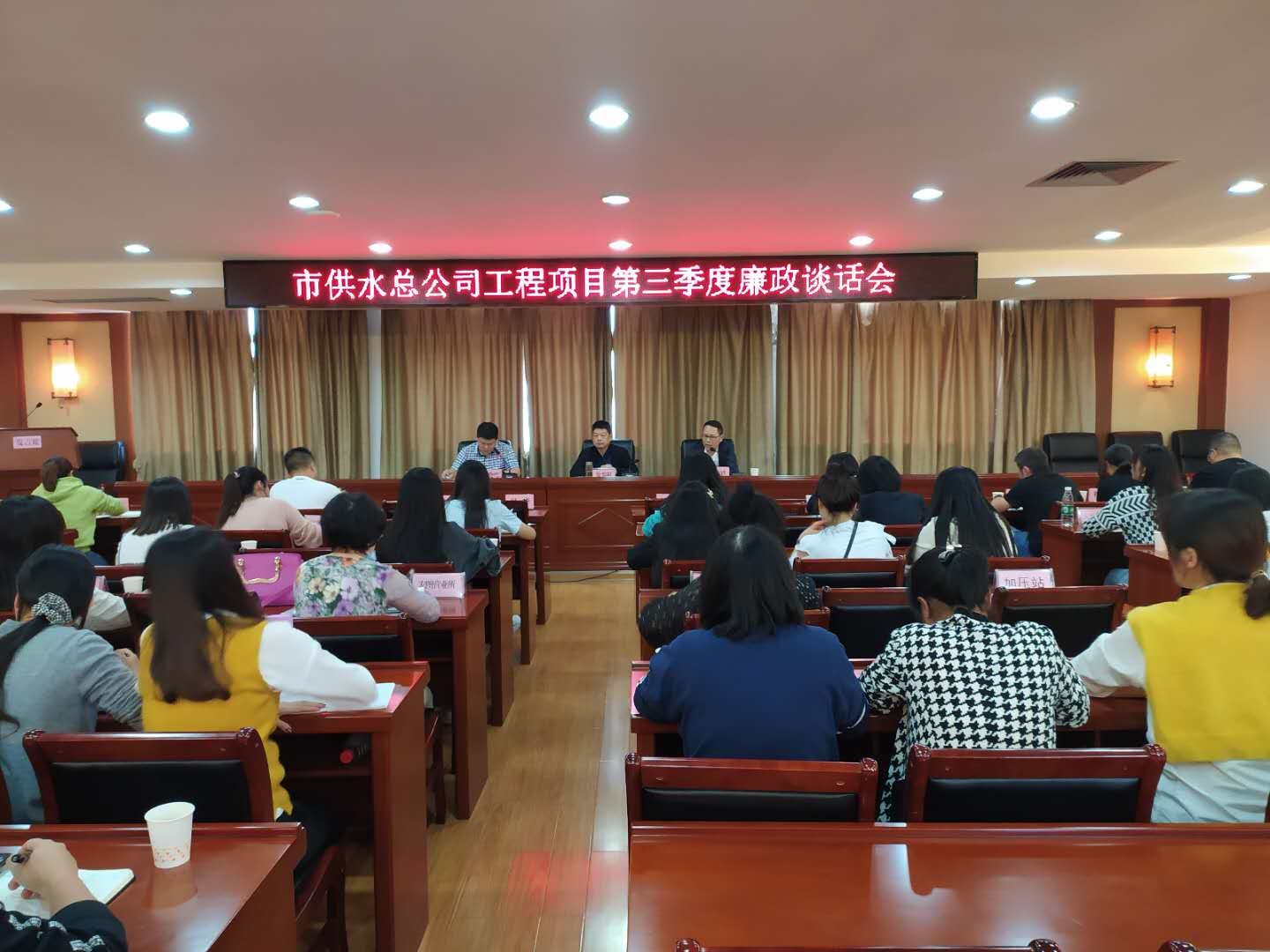 為進(jìn)一步做好財(cái)務(wù)工作,提高財(cái)務(wù)人員廉政意識,防范財(cái)務(wù)風(fēng)險(xiǎn),9月24日下午,市供水總公司舉行工程項(xiàng)目(財(cái)務(wù)管理方面)第三季度廉政談話會。公司黨委副書記、紀(jì)委書記徐黎明主持會議,黨委委員、總會計(jì)師劉高軼進(jìn)行廉政談話,總公司財(cái)務(wù)部全體工作人員、各獨(dú)立核算二級單位財(cái)務(wù)分管負(fù)責(zé)人和全體財(cái)務(wù)人員、非獨(dú)立核算二級單位和機(jī)關(guān)各部門報(bào)賬員,公司紀(jì)委委員、各支部紀(jì)檢委員參加會議。